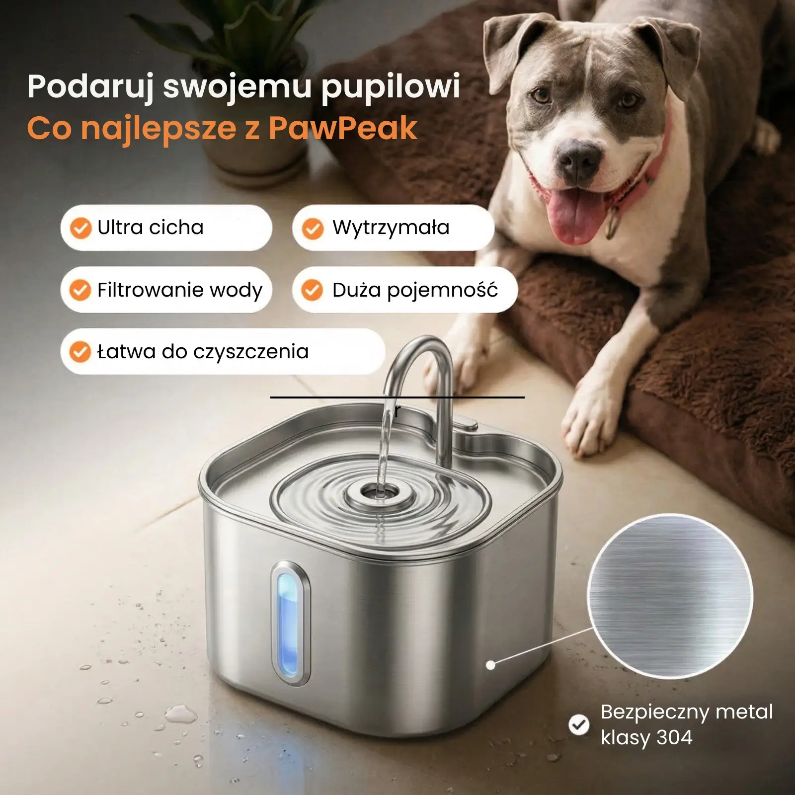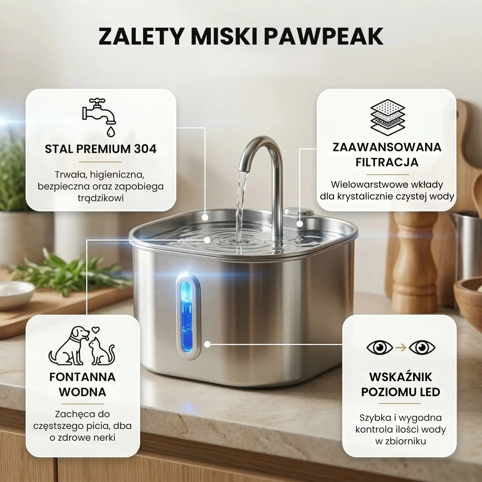 Strumień płynącej wody naturalnie zachęca do picia, dbając o nerki i witalność pupila. PawPeak to cicha, nowoczesna i krystalicznie czysta woda każdego dnia.