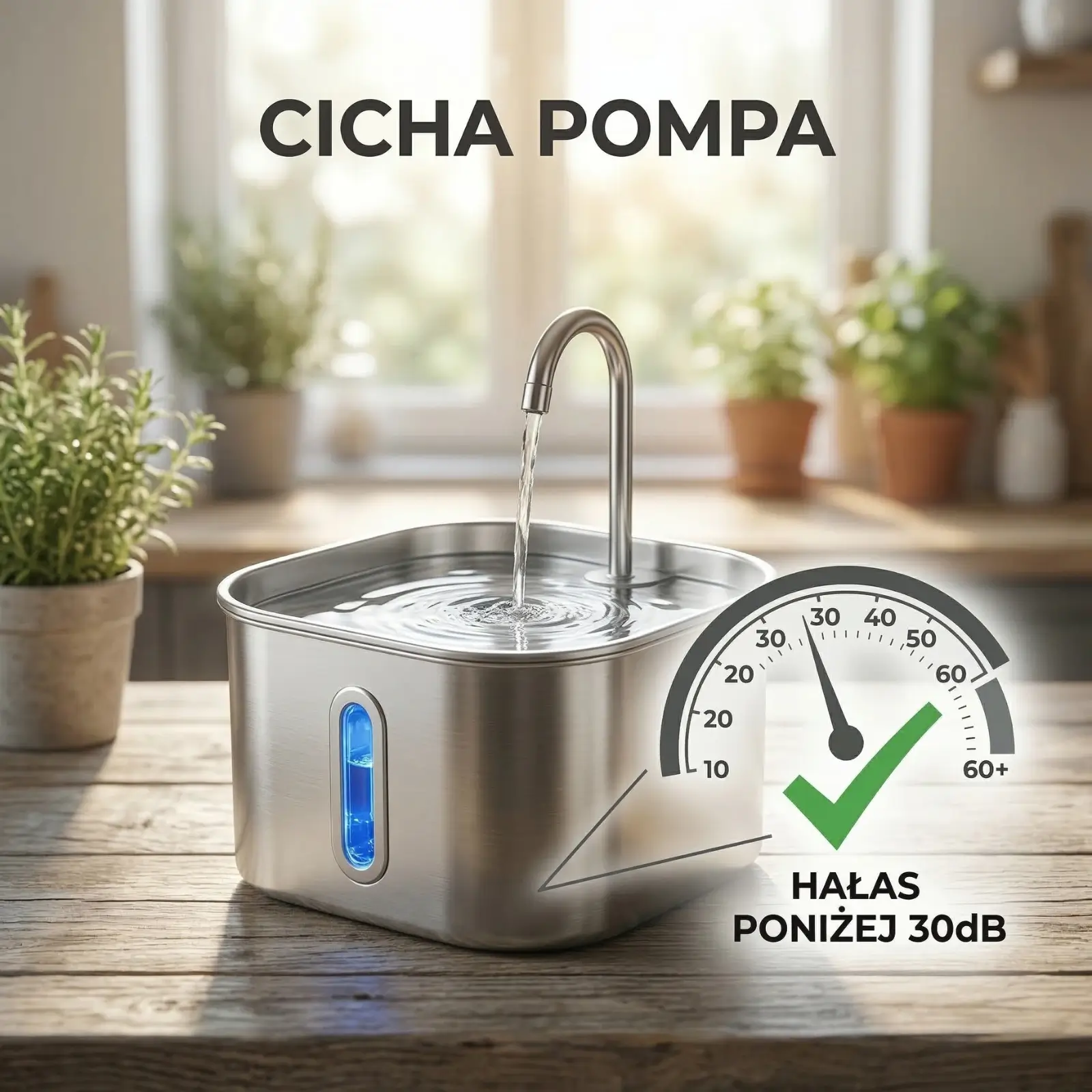 Wersja Smart (z sensorem): Wyposażona jest w czujnik ruchu (PIR). Pompa włącza się automatycznie tylko wtedy, gdy Twój pupil zbliży się do fontanny (na odległość ok. 1-2 metrów). Gdy zwierzę odchodzi, woda przestaje lecieć. Dzięki temu wersja z sensorem jest maksymalnie energooszczędna, całkowicie bezgłośna w nocy (gdy pupil śpi) i znacznie wydłuża żywotność samej pompy oraz filtrów.